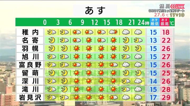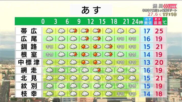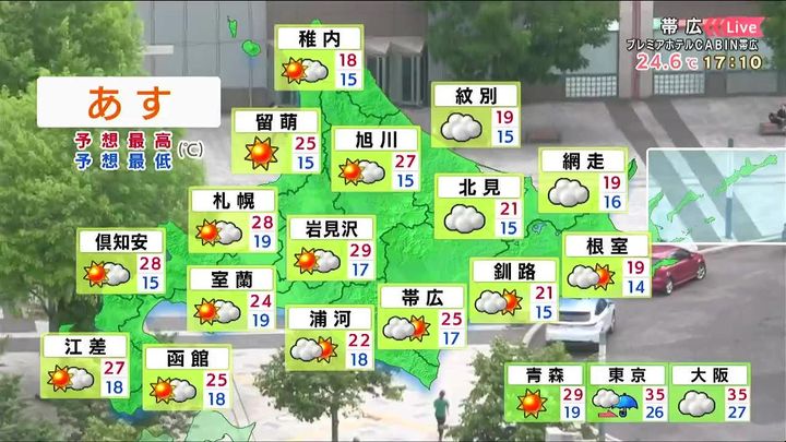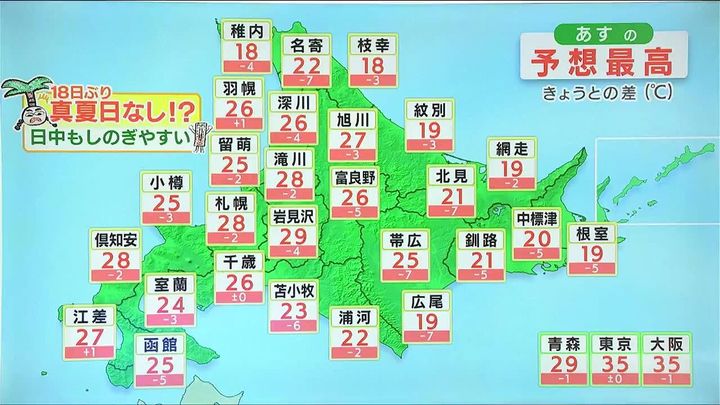 きょう9日(水)真夏日になった札幌は28度、岩見沢29度、旭川は27度です。帯広はきょうより7度低い25度、稚内は18度と昼間でも涼しいでしょう。
