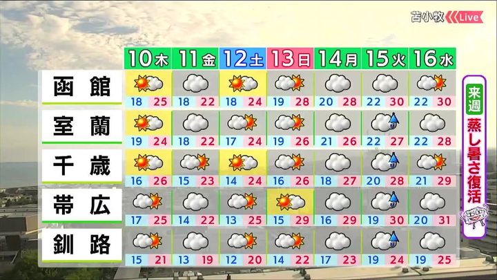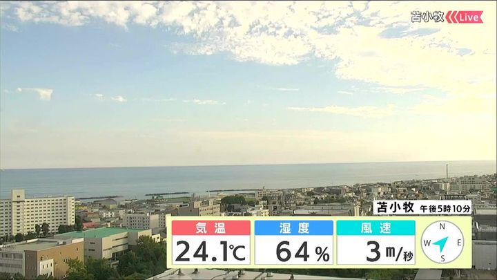 苫小牧は晴れていますね。太平洋側は霧の季節ですが、今年は晴れの日が多くなっています。苫小牧はあす10日(木)も晴れますが、週末以降は霧がかかりやすくなります。