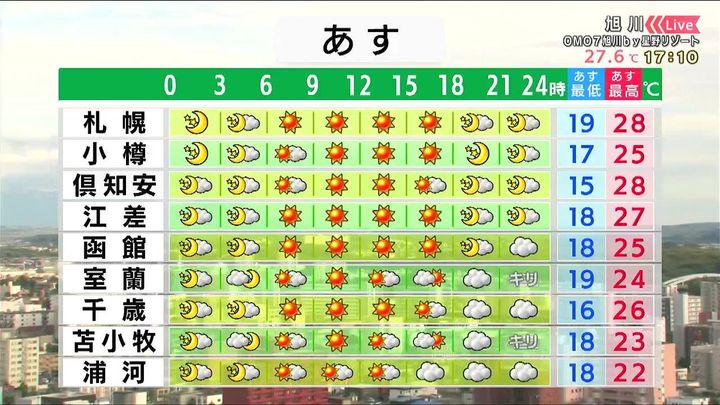 広く晴れますが、胆振や日高地方は午後を中心に低い雲や霧がかかります。真夏日にならないとはいえ、札幌や倶知安は28度で暑さ対策は必要です。