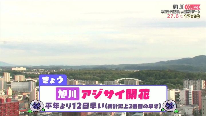 日ざしがたっぷり届いた旭川ではきょう9日(水)、アジサイが開花しました。平年より12日早く、統計史上2番目の早さです。暑さのせいで植物の開花も記録的な早さですね。
