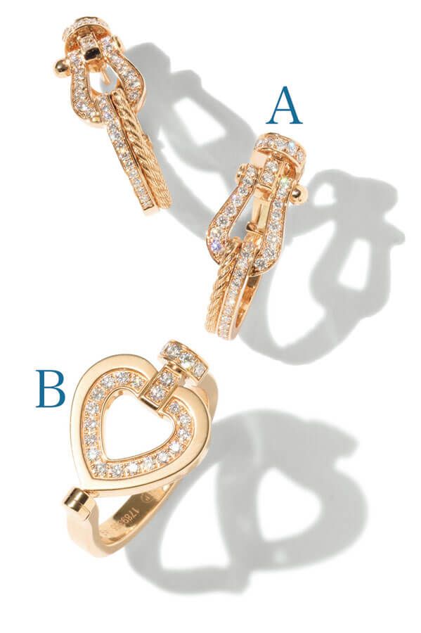 Aイヤリング[K18PG×フルパヴェDIA]¥1,837,000、Bリング[K18PG×DIA×MOP]¥704,000/ともにフレッド(フレッド カスタマーサービス)