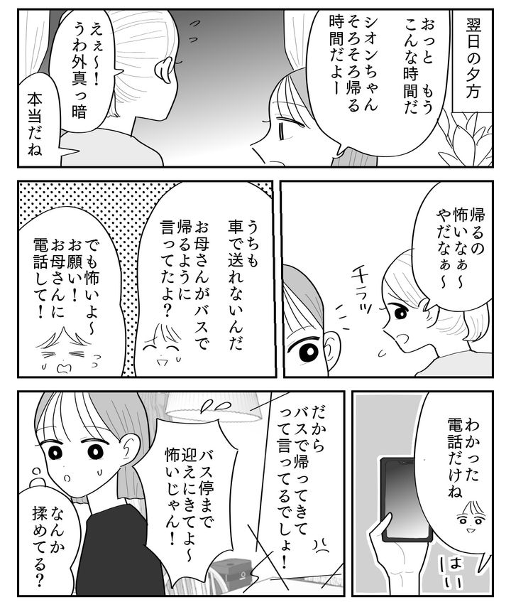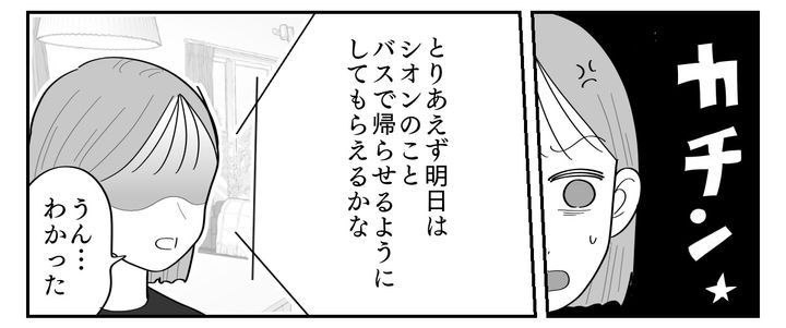 今できる精一杯の返事をしたのに「過保護じゃない?」と笑われて、思わずカチンと来てしまいます。けれど翌日はシオンちゃんがわが家に来る約束になっていました。ひとまず受け入れることにして、夕方帰る時間に声をかけました。