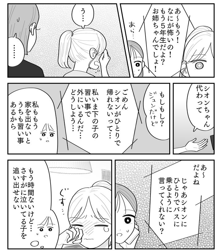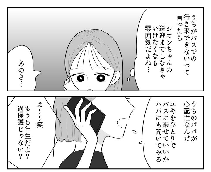 私はジュン。娘のユキは小5です。小2から仲良しのシオンちゃんとは週に2~3回、どちらかの家で遊んでいます。いつもユキがシオンちゃんの家に行くときは私が、わが家にシオンちゃんが来るときはマリカさんが車で送迎してきました。けれど数年経って、それぞれの家の事情も変わってきたのです。マリカさんは下の子の習い事がはじまり「お迎えに行けないからバスで帰らせる」と言いだしました。そして「ユキちゃんが来たときもバスで帰らせるようにしてほしい」と……。