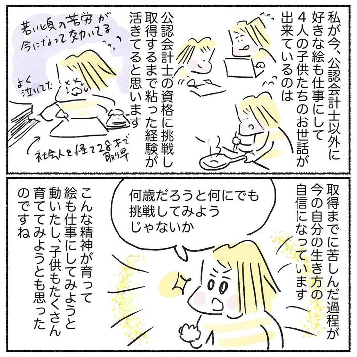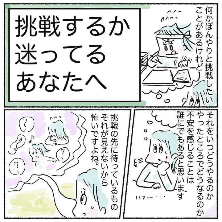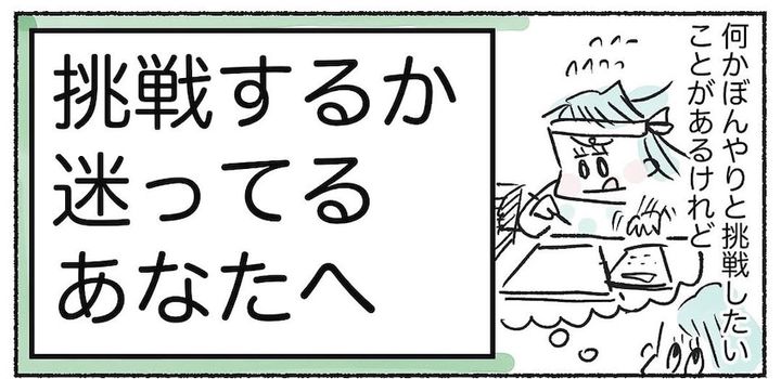 こんにちは!4児の母で漫画家兼公認会計士のAyumiです。突然ですが、みなさん最近なにかに挑戦してますか?新しいことに挑戦するってなかな勇気のいること。歳を重ねれば重ねるほど、経験が邪魔をしてあと一歩が踏み出せない…。でもね、人生なんてあっちゅー間!自分の心にシンプルに従うべし!今回はそんなわたしの体験談を含めたお話です。詳しくは漫画をご覧ください♪