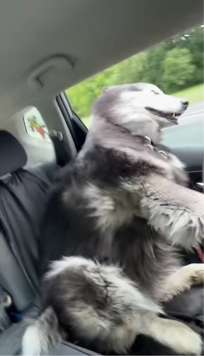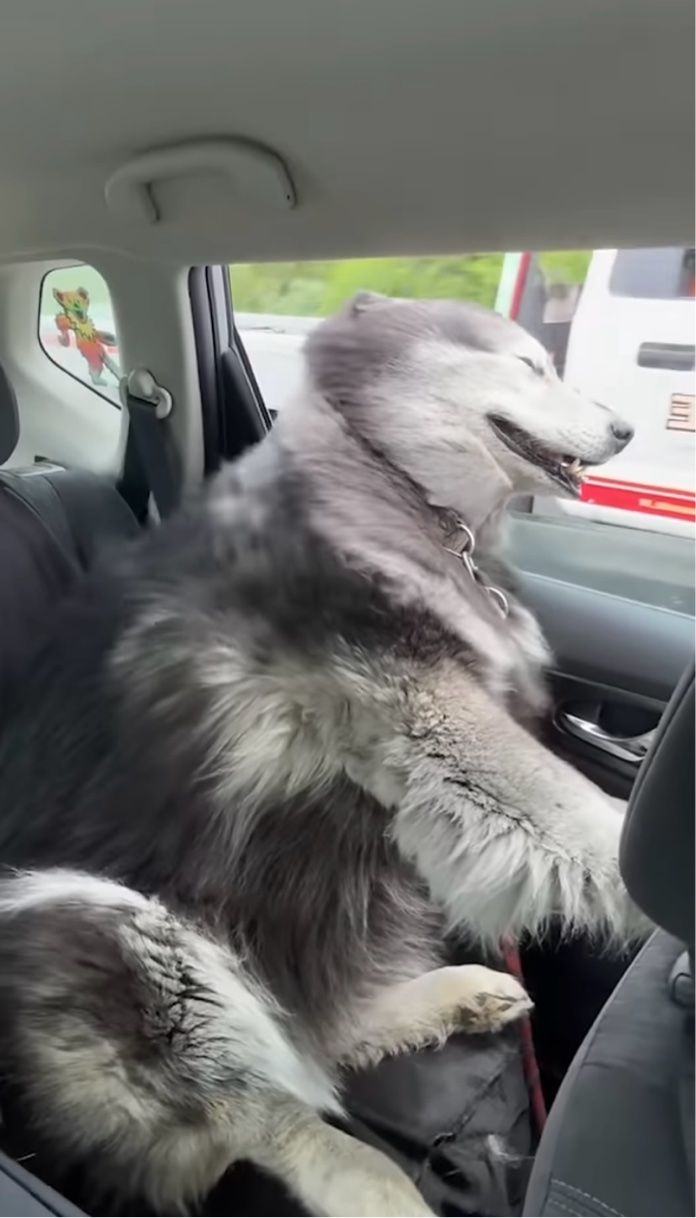 ハイウェイをドライブ中の車には、ハスキー犬の『ルナ』の姿が。 この子は、シートに座ると窓から顔を出していました!