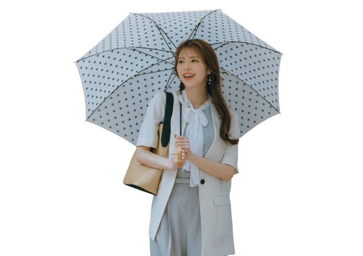 白ジャケット¥15,400/ココ ディール ボウタイトップス¥11,880/CELFORD ルミネ新宿2店 ベルト付きパンツ¥5,489/ロペピクニック(ジュン) カゴバッグ¥8,690/カシュカシュ(アンビリオン) メッシュパンプス¥47,300/ファビオ ルスコーニ(エリオポール代官山) 晴雨兼用傘¥14,300/トラディショナル ウェザーウェア(トラディショナル ウェザーウェア ルミネ有楽町店) パールピアス¥12,980/yuma(ロードス)