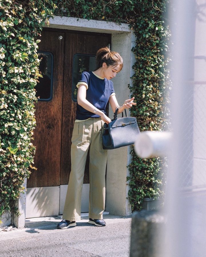 ニット¥1,990(UNIQLO)中に着たTシャツ¥5,280(ミラ オーウェン/ミラ オーウェン ルミネ新宿2店)パンツ¥33,000(タンジェント/ザ エディット ストア)ピアス¥24,200(Jouete)バングル¥39,600(ete)ベルト¥47,300(ボナベンチュラ)バッグ¥132,000(デメリエー ロンドン/アルアバイル)スニーカー¥35,200(オートリー/トヨダトレーディング プレスルーム)