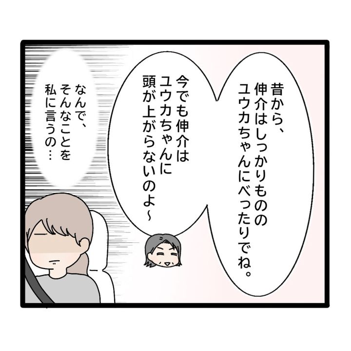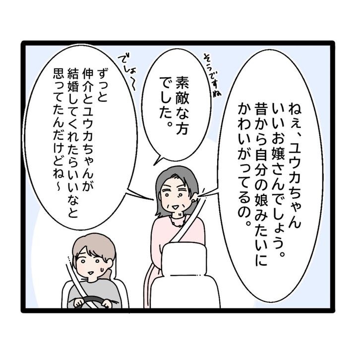 帰りの車の中でもユウカさんのことばかり話す義母は上機嫌でした。「ねぇ、ユウカちゃんいいお嬢さんでしょう。昔から自分の娘みたいに可愛がってるの。」私は「そうですね、素敵な方でした。」と答えるしかありませんでした。義母はさらに「ずっと伸介とユウカちゃんが結婚してくれたらいいなと思ってたんだけどね~」とモヤモヤしている私に追い打ちをかけるようなことを言いました。