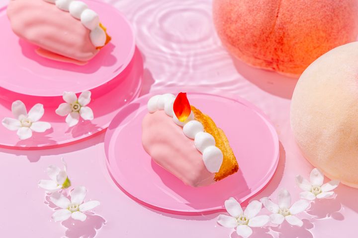 山梨県産の白桃「なつっこ」を使った極上スイーツや、見た目が桃そっくりのムース、カクテルの「ソルティドッグ」をイメージした桃のスープなど、桃を感じる夏らしいスイーツ5種とセイボリー3種がラインナップ。しっとりとした食感が人気のスコーン(プレーン&マンゴー)にはクロテッドクリーム、白桃とグァバのジャムが添えられています。