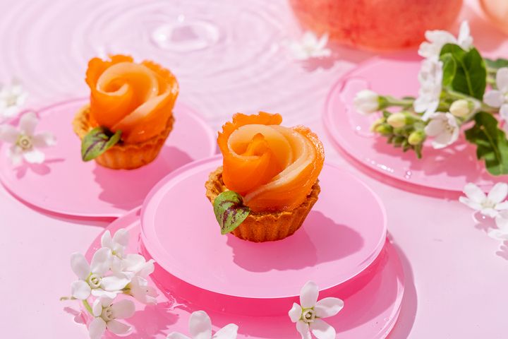 スモークサーモンと桃のロザス タルト仕立て桃ペーストを混ぜたまろやかなクリームチーズをタルトに入れ、スモークサーモンと桃を重ねたセイボリー。