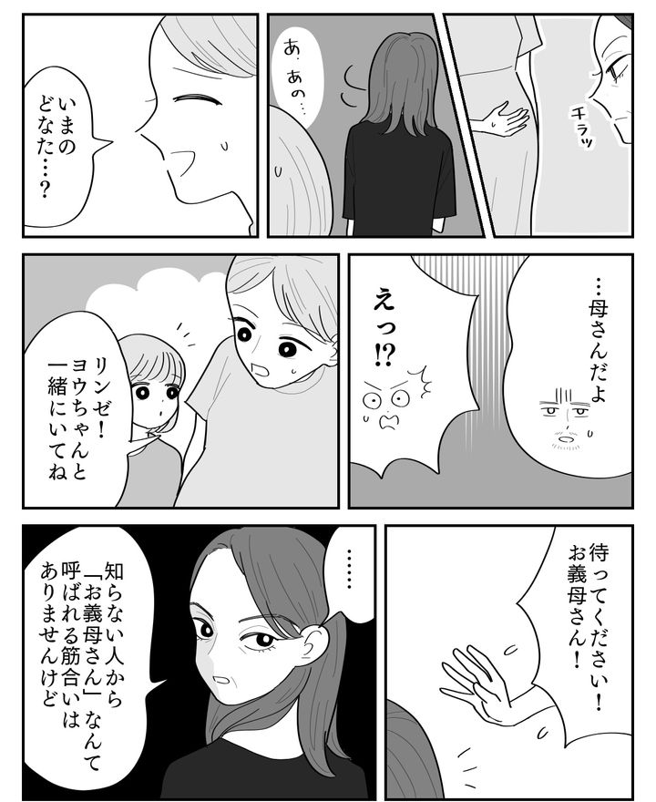 するとそのとき、ヨウスケが人影に気付いて「あっ」と声をあげました。そこには60代くらいの女性が立っていました。もしや、この人は……! しかしその女性は私の大きなお腹をチラリと見ると、顔をしかめて去って行きます。