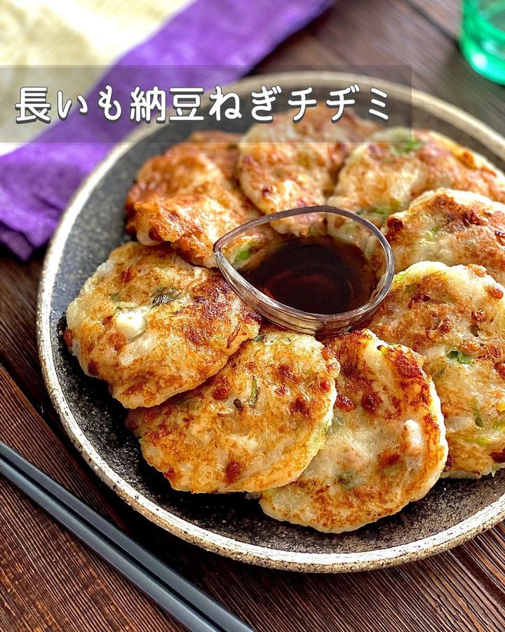 焼きたてふわとろ、冷めたらもちもち♪ こんがり香ばしいチヂミは、納豆と長いものもっちり食感とねぎの風味があとひくおいしさ。