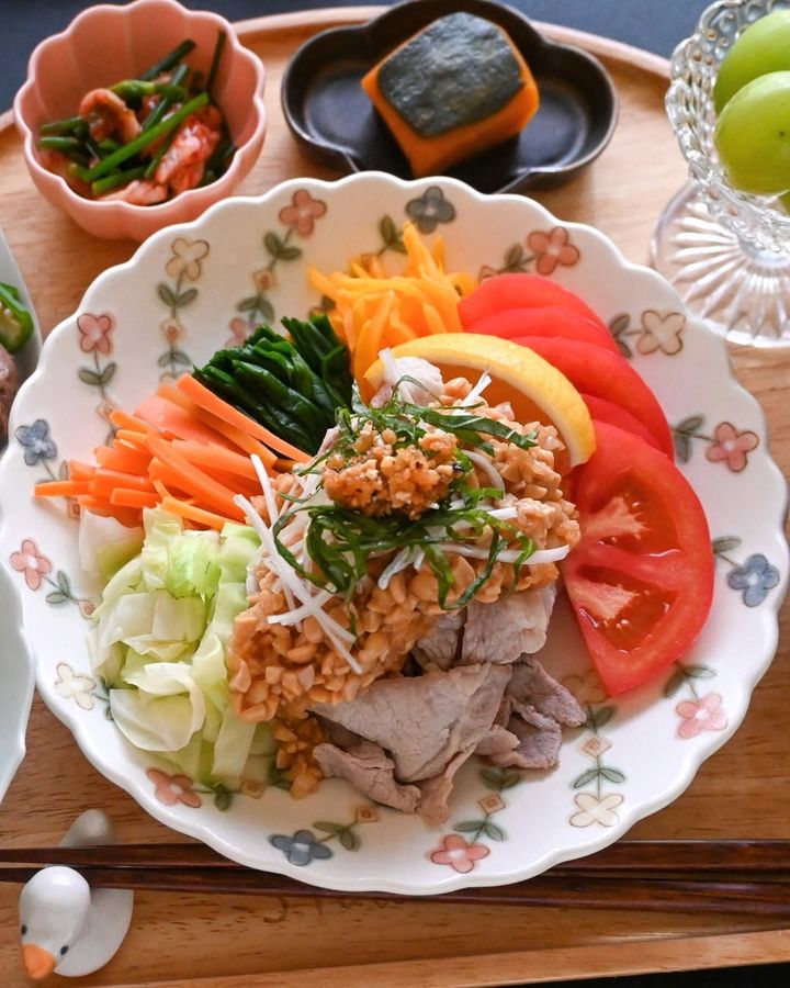 野菜たっぷりの豚しゃぶサラダに、大根の自然な甘みと食感が楽しめる鬼おろしにひきわり納豆を合わせたドレッシングをかけて。