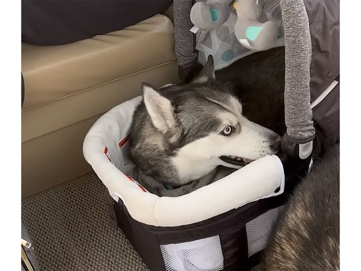 3. 「ここ使ってみたかったの!」ハスキー犬が赤ちゃんポジションを死守