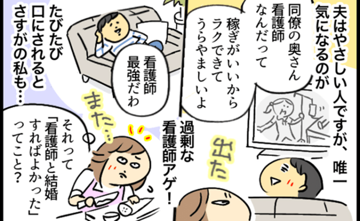 夫は、看護師の妻がいる同僚の話や、義母が看護師として働いていたから家が安泰だったなどの話から、たびたび「妻が看護師だと得」「女の仕事は看護師が最強!」と言っていることはまだ我慢ができていました。