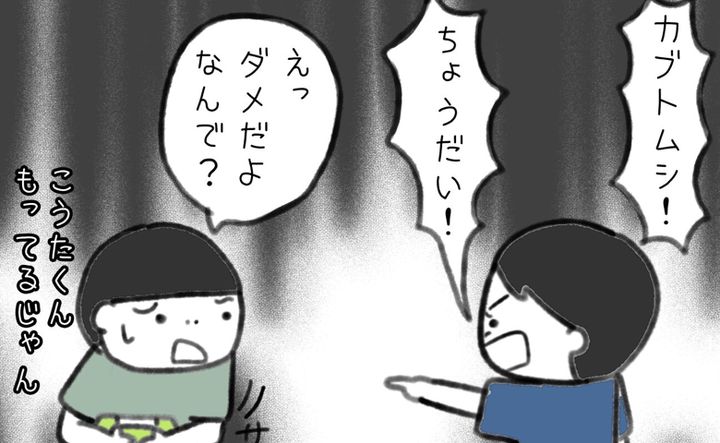 すると、こうたくんはかいくんのカブトムシを欲しがります。かいくんがキッパリ断っても「なんで!」「ちょうだい!」「かせ!」とワガママを言い続けるこうたくん。