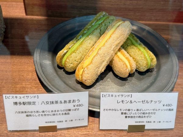 注目は、博多駅限定のビスキュイサンド「八女抹茶&あまおう」。 香り高い八女抹茶のクリームと、あまおうジャムが重なり合った贅沢なサンドスイーツです。ふわふわしっとりの生地に、ほろ苦さと甘酸っぱさが絶妙にマッチ。今年の夏、イチオシのメニューだそうですよ。