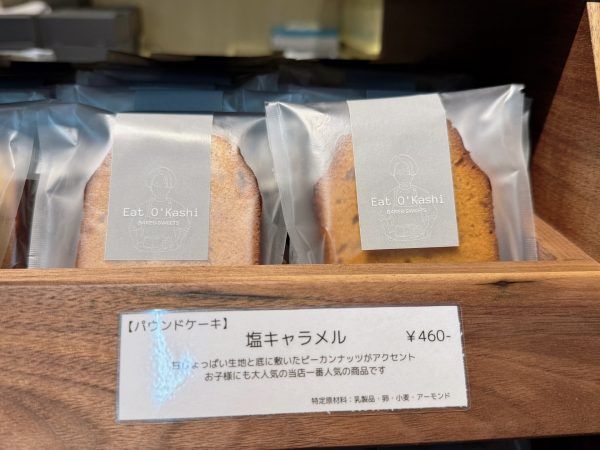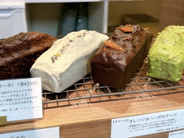 店頭には、朝焼きたてのフィナンシェや、まるっと一本のデコレーションパウンドケーキもずらり。中でも一番人気は「塩キャラメルのパウンドケーキ」。しっとりとした生地にキャラメルのコクが溶け込み、底に敷かれたピーカンナッツがカリッとした食感のアクセントに。
