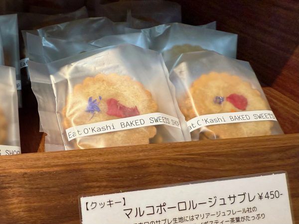 そして、すぐに目を惹かれたのが「マルコポーロルージュサブレ」。紅茶の専門店マリアージュフレール社のフレーバードティー「マルコポーロルージュ」の茶葉をたっぷり練り込んだ生地に、小さな花のデコレーションが施されており、目にも華やか。 「味わいの華やかさに負けないよう、お花を添えています。ギフト用に選ばれる方がとても多いです。」とスタッフの方もお話されていました。