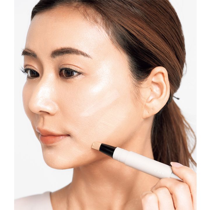 コレクティング ヴェール コンシーラーの暗めカラー(06)をフェイスラインに沿って影を作るように塗って。頰骨の下部分には明るめカラー(01)を仕込んで、陰影の対比で輪郭が引き締まるように。