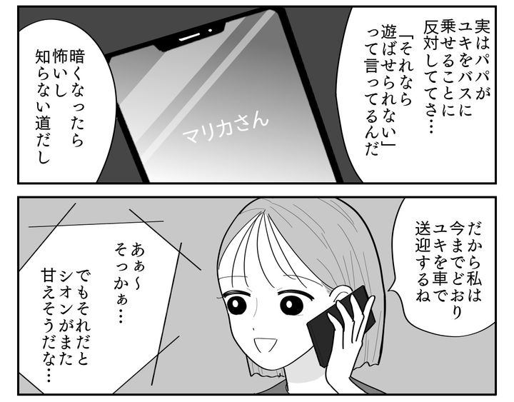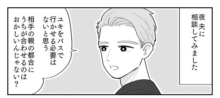夫の意見はもっともです。次の日、私はマリカさんに言いたいことをハッキリ伝えることにしました。「わが家はユキをバスで帰らせることはしない。今までどおり遊ばせるときは車で送迎する」これが夫と話し合って出した結論でした。