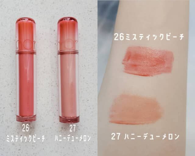 塗りたての色がそのまま12時間持続し、長時間ツヤをキープできるのも魅力。中でもおすすめは、ブルベ向けの26番「ピーチレッド」と、イエベ向けの27番「オレンジメロン」。どちらも肌なじみが良く、顔色まで明るく見せてくれます。マスクにもつきにくく、夏の外出時にも安心して使えますよ。