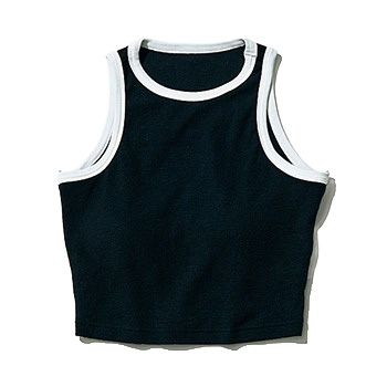 パイピングショートタンクトップ/TW コンパクトなショート丈のアメスリタンク。黒だとメンズライクにもなるところ、白が入ることで女性らしさもあり。背中は丸くカットされていてヘルシー。