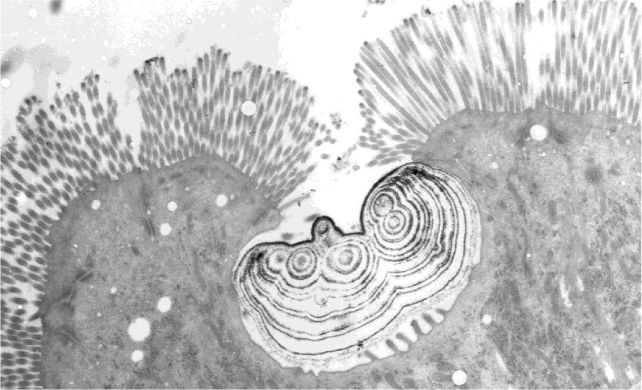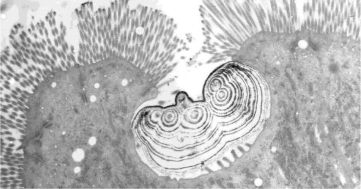 この細胞は、腸の内側にある「エンテロサイト(吸収細胞)」とは別のタイプで、内部に小さなくぼみ(クリプト)を持ち、その中でカルシウムやリン、鉄を含む粒子を作り出す構造になっていました。