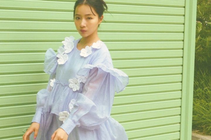 フラワーモチーフつき水色ワンピース 38,500円/ファウンドリーミューズ リング 4,180円/Liquem バッグ 9,790円/minitmute(HANA SHOWROOM)スニーカー 15,400円/ロックフィッシュウェザーウェア(blaseout)