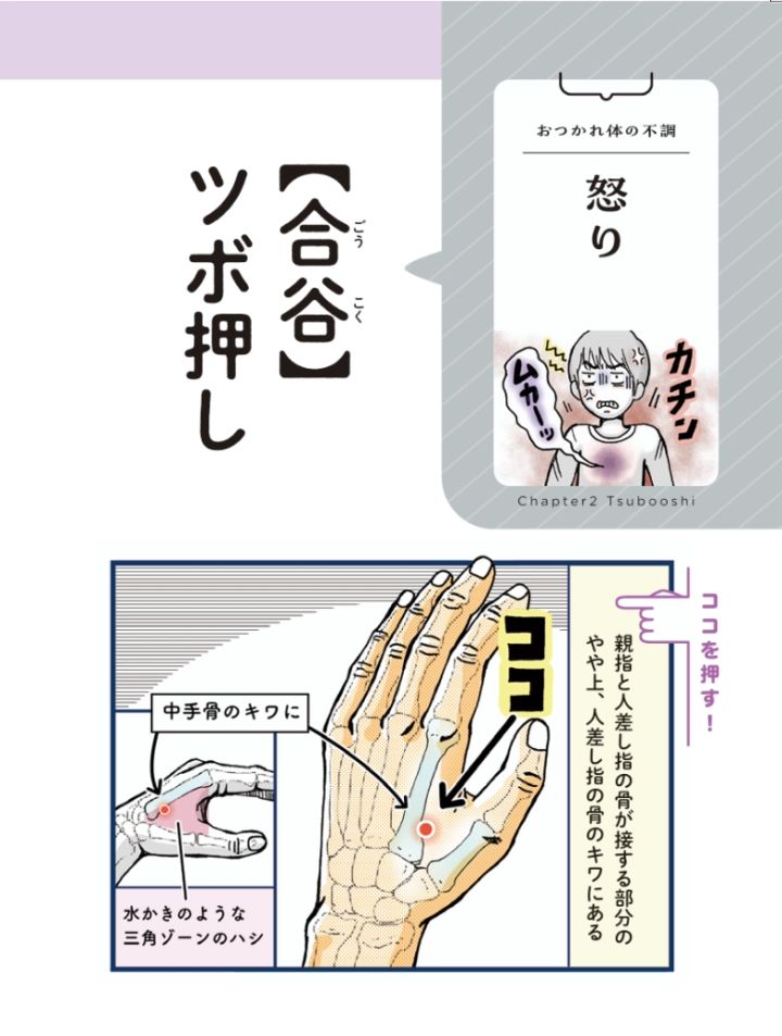 今回は『ピンポイントで整う!押し活』第2章「おつかれ体の不調 ツボ編」より、【イライラ】【怒り】に関する効果的な押し活をご紹介します。