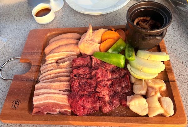 ほどなく、バーベキュー用のお肉が運ばれてきました。一人あたり牛肉、豚肉、手羽先、ソーセージや野菜もあって種類豊富、これだけでも十分な量です。