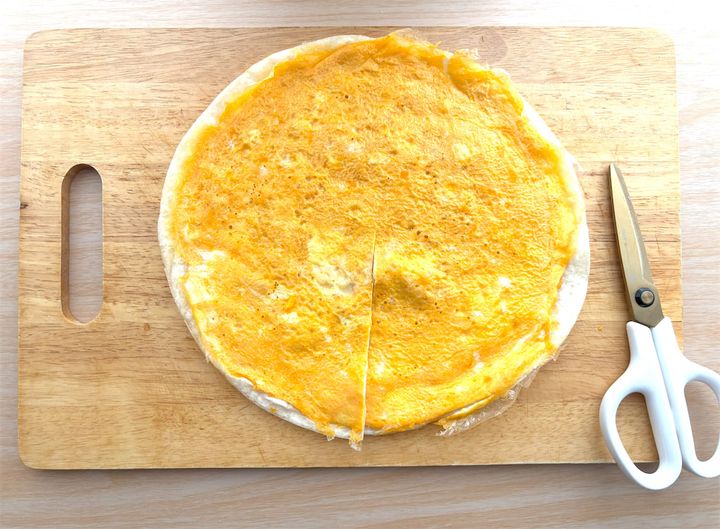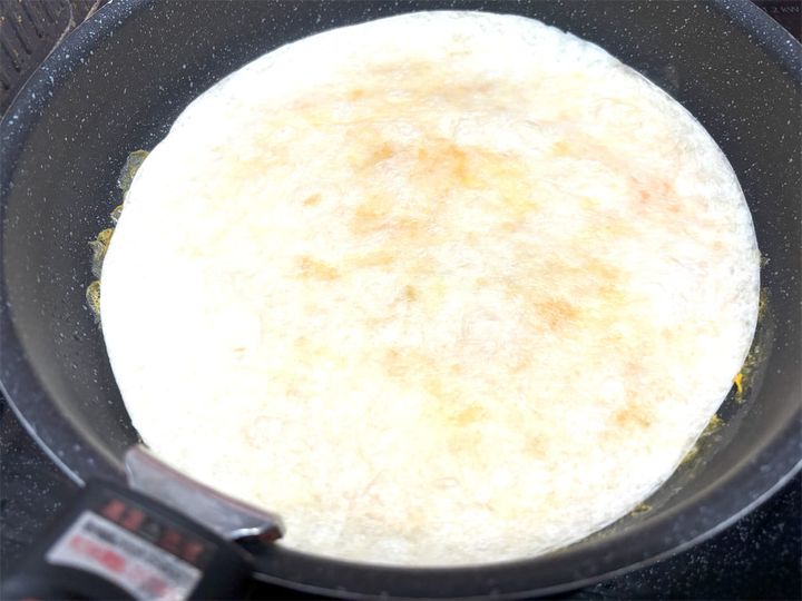 1~2分経って裏側が焼けてきたら、フライパンの卵の上に、下の画像のようにトルティーヤを1枚置きます。