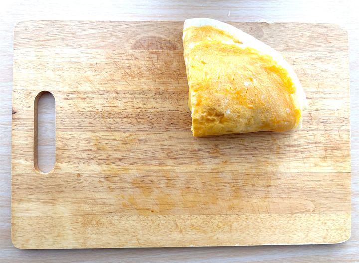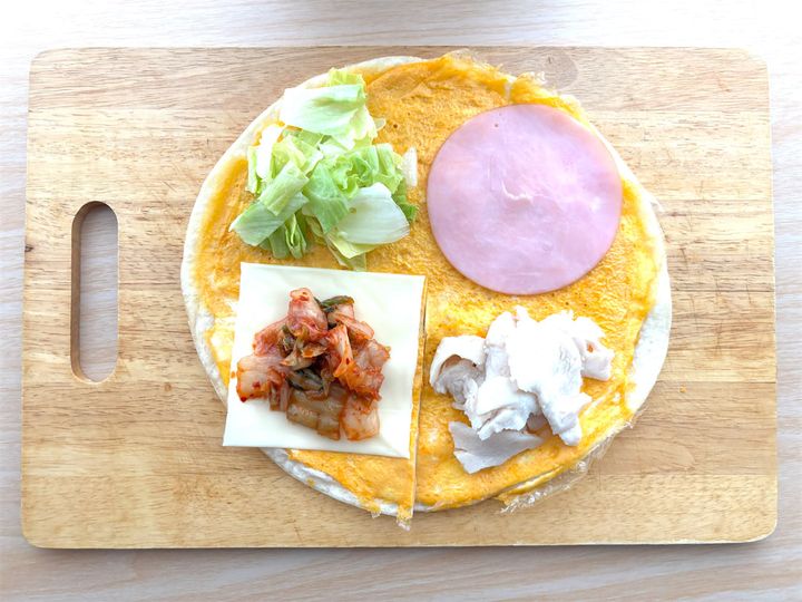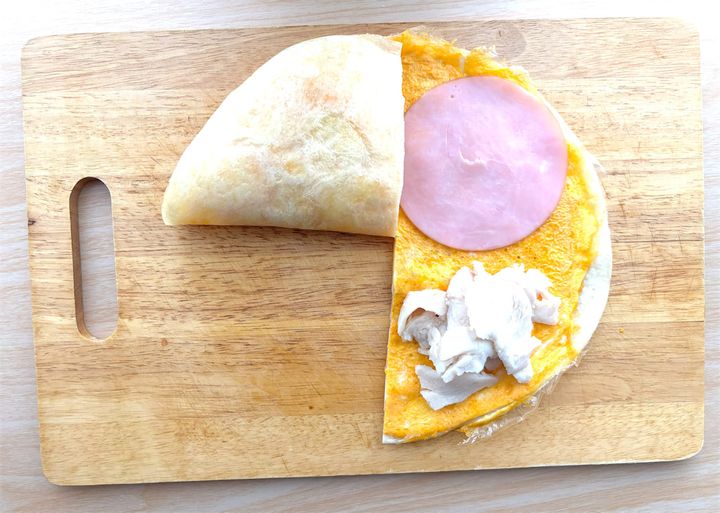 3. フライパンから取り出したら、具材を乗せて折りたたみます。