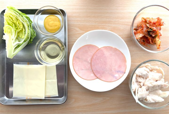 (1)の場所にスライスチーズとキムチを置き、(2)の場所にレタス、(3)の場所にハム、(4)の場所にサラダチキン、という順番に具材を並べていきます。