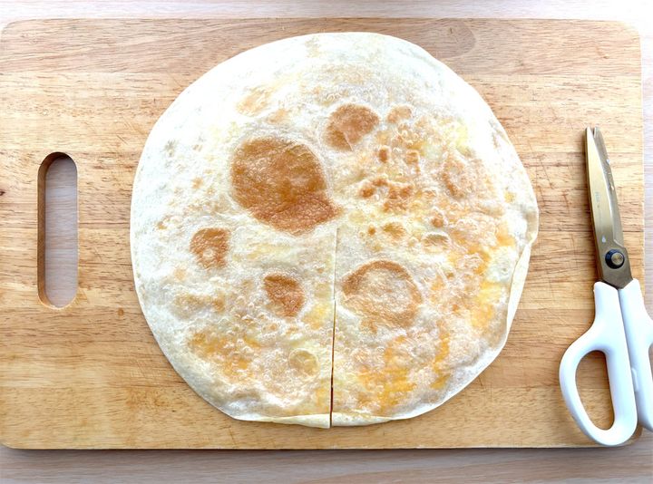 トルティーヤ側を上にしてまな板の上に置き、時計の「6時」の位置から円の中心に向かって包丁やキッチンばさみを使って1か所切り込みを入れます。