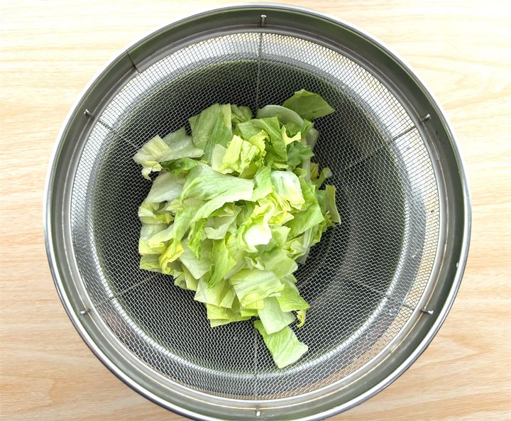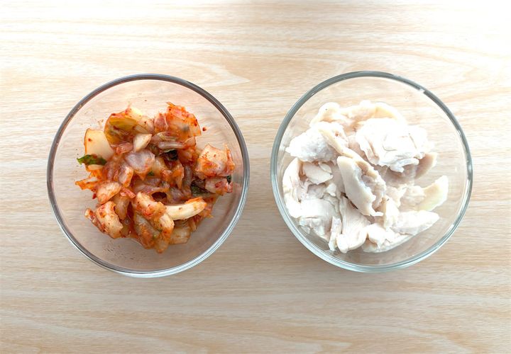 サラダチキンは、袋から出して、大きなものがあれば少し小さく裂いておきます。
