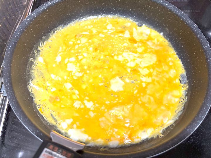 溶き卵を入れて広げ、薄焼き卵を作る要領で焼きます。