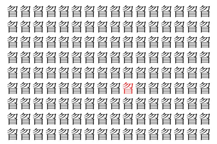 画像の中には、「䀜」という漢字が縦に9行、横に16個並んでいます。 全部で144個となりますが・・・、そのうち1つは「異なる漢字」となってますよ!!