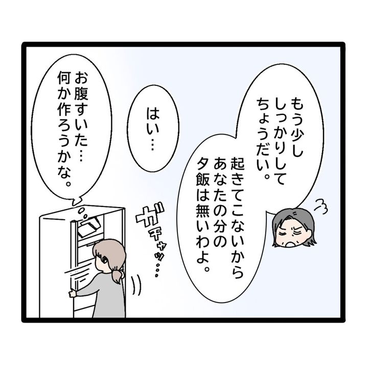 「もう少ししっかりしてちょうだい。起きてこないからあなたの分の夕飯は無いわよ。」と不機嫌そうに言われてしまいました。お腹が空いていた私は、自分で何か作ろうと冷蔵庫を開けると