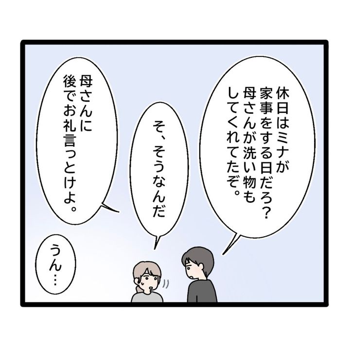 義母のお出かけの送り迎えを頼まれ、長時間の運転で疲れてしまった私は、ちょっと休むつもりでうっかりそのまま寝落ちしていました。夜9時過ぎに伸介に起こされ「休日はミナが家事をする日だろ?母さんが洗い物もしてくれてたぞ。」と責められてしまいました。「母さんに後で御礼言っとけよ。」という伸介に「うん」としか言えませんでした。