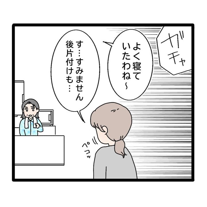 キッチンへ行くと、「よく寝ていたわね~」と義母。「す・・・すみません後片づけも」と頭を下げると