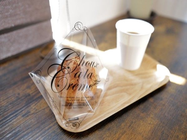 この暑さで抹茶味のアイスクリームに心惹かれつつ、注文後にクリームを詰めてもらえるという『シュークリーム』(税込290円)を選びました。お会計の際に驚いたのが「コーヒー無料でおつけしますが、ホットとアイスどちらになさいますか?」と聞かれたこと。こちらのお店では、注文すると無料でコーヒーを頂けるのです。コーヒーの持ち帰りも可能とのことで、コーヒーカップ用の蓋やお砂糖、ミルクのサービスもありました。