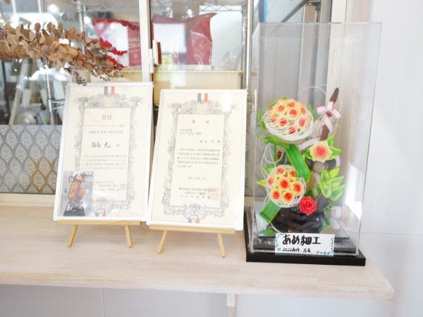 そして店内で目を引いたお花の形をしたこちら、高石さんの作ったあめ細工だそうです。佐賀や福岡のコンテストでは、アメ部門にて会長賞や最優秀賞の受賞歴もある高石さん。右端の作品は2022年度のものですが、「あめ細工は光沢などは落ちるけれど保存可能」とのこと。「ケースも含め10kgほどあり、大変壊れやすいのでコンテストに出品の際は当時住んでいた佐賀から福岡まで、ケースごと手で抱えて運びました」と伺い、てっきり車に固定して運ぶのかと思っていたのでびっくりしました。