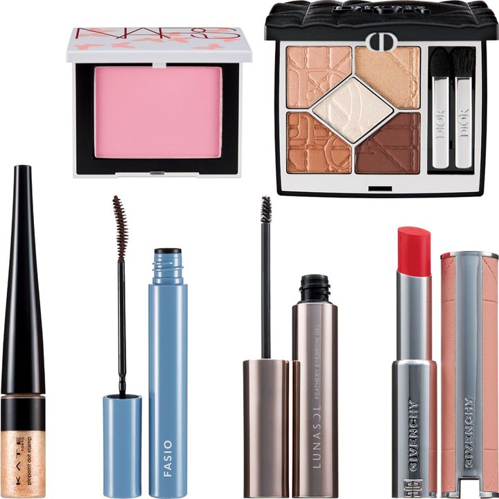 上段左から:上気したような血色感を叶えます。NARS ブラッシュ N 905A ¥5,060(NARS JAPAN)※数量限定、ブラウンの濃淡で自然な立体感をつけながら印象的な目元に。ディオールショウ サンク クルール 557 ブラウン カシミア ¥10,010(パルファン・クリスチャン・ディオール)※数量限定、汗、水、涙に強く、長時間ラメが落ちにくく。目元を“うるっ”と強調。ラメを点置き ケイト ピンポイントドットスタンプ EX-3 ベージュスター ¥1,540(編集部調べ)(カネボ ウ化粧品)、深みのあるブラウンがまつ毛を印象的に。ファシオ ウルトラ WP マスカラ(カール)02ブラウン ¥1,320(編集部調べ)(コーセー)※7/16発売、毛流れを整えて、ツヤと立体感のある眉に。ルナソル フェザリーアイブロウジェル 00 Clear ¥3,300(カネボウ化粧品)、ふっくら潤いのある、鮮やかな唇を演出。ジバンシイ ローズ・パーフェクト・シャイン No.304 コーラル・レッド ¥5,060(パルファム ジバンシイ)