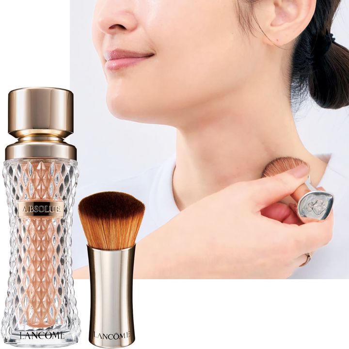 ファンデは肌と同じ〜一段暗めの色が◎。手の甲にパール粒大を出したらブラシに馴染ませ、顔の広い面からフェイスラインへ向かってすべらせるように塗布します。ブラシの残りで首までカバー。ランコム アプソリュ ザ フルイド ファンデーション 130 35ml ¥19,250(ランコム)※ブラシは本体購入時の付属品