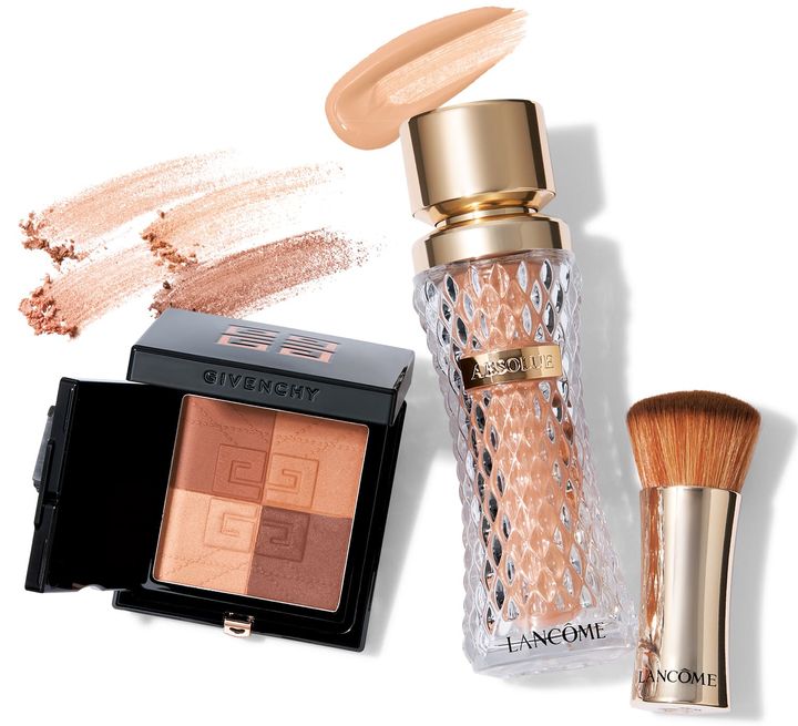 左:肌の色味と光を巧みに操る、4色のパウダーが彫刻のように美しい影を描くシェーディングパウダー。テクニックいらずでヘルシーな美肌を叶えます。GIVENCHY プリズム・リーブル・ブロンザーパウダー 002 ポプリン・ブロンズ ¥7,480(パルファム ジバンシイ)右:ローズ由来成分とスキンケア成分の“エッセンス”を贅沢に配合、ランコム最高峰の美容液ファンデ。プロ級の仕上がりが叶うブラシも優秀。LANCÔME アプソリュ ザ フルイド ファンデーション 130 35ml ¥19,250(ランコム)※ブラシは本体購入時の付属品