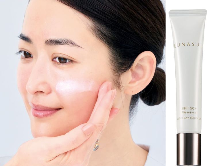 下地はしっかりカバーしたい両頰からフェイスラインへと指で塗り広げていきます。顔全体に塗布したらデコルテまで広げます。心地よいテクスチャーでくすみを払って透明感アップ。潤いの膜を作る美容液UVはファンデのノリも良くなります。ルナソル グロウデイ セラムUV SPF50+・PA++++ 30g ¥5,280(カネボウ化粧品)
