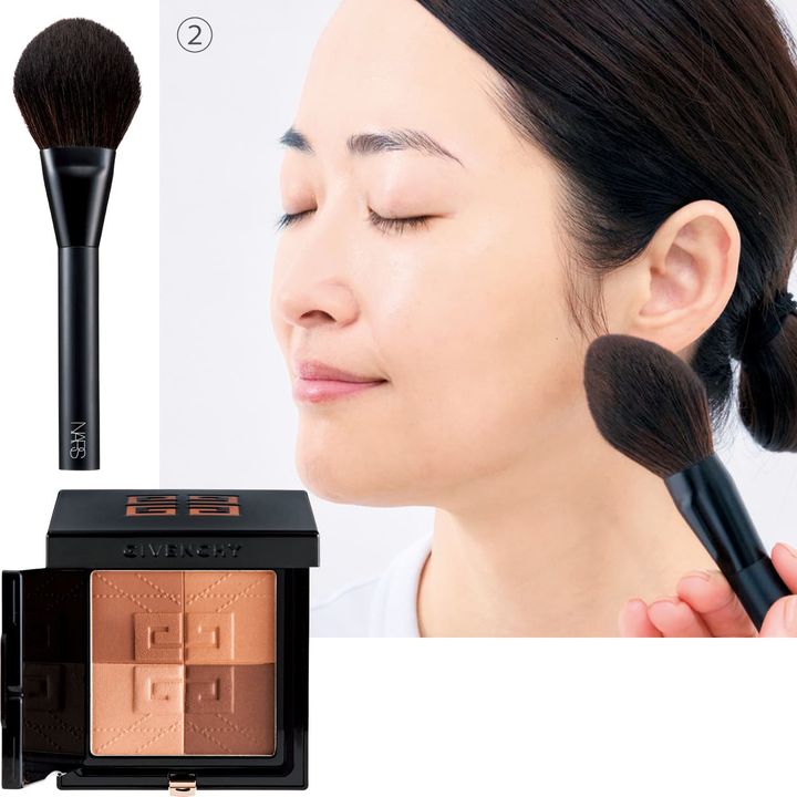 ①大きめのブラシに4色をブレンドしながら取り、一旦ティッシュにトントンと置き量を調節します。②顔の側面からふわっと馴染ませ、顔の中心に向かって全体的にぼかしていきます。ジバンシイ プリズム・リーブル・ブロンザーパウダー 002 ポプリン・ブロンズ ¥7,480(パルファム ジバンシイ)NARS パウダーブラシ #13 ¥6,820(NARS JAPAN)