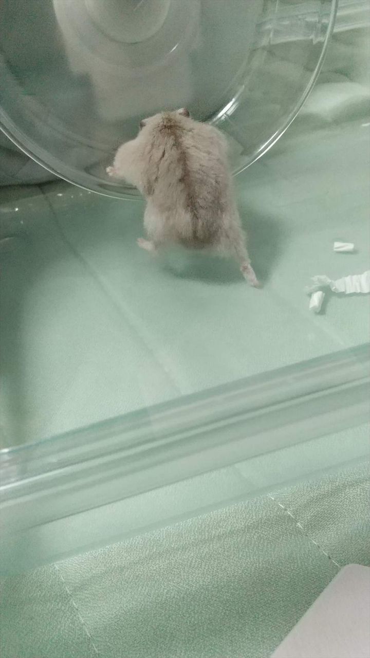 回し車に乗ろうとしているところだったようで、おててをついて身を乗り出しています。 その後ろ姿から「よっこいせ」という言葉が思い浮かびますね~。
