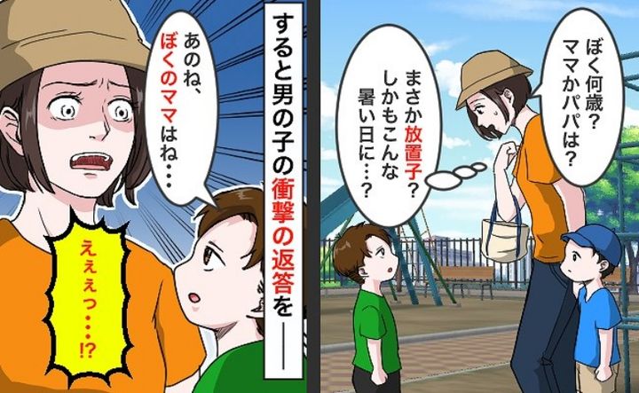 6歳の長男と出かけた大きな公園。そこでひとりで遊ぶ長男と同い年の男の子がいたのです……。私はもしかして放置子? と心配になりました。男の子に、ママやパパはどこにいるかと聞いてみることに。すると驚きの事実がわかったのです――。